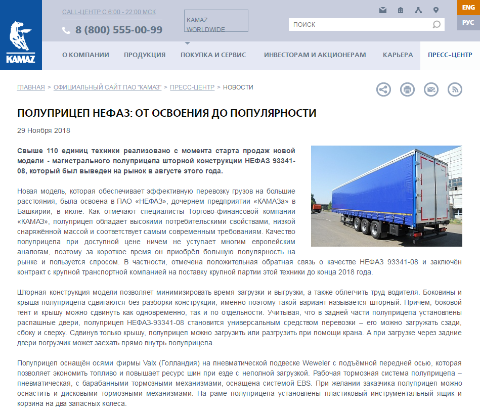这款新半挂车是今年7月在PJSC NEFAZ生产,PJSC NEFAZ是KAMAZ的子公司。这款半挂车能为货物提供有效的长距离运输。按照KAMAZ公司的介绍,这